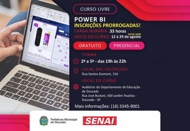 A Prefeitura Municipal de Dourado informa que as inscrições para o curso livre de Power BI foram prorrogadas! Este curso, com carga horária total de 33 horas, será oferecido gratuitamente e de forma presencial.